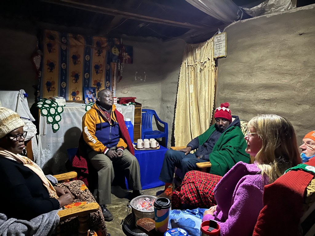 Wir sind zu Gast bei einer pfiffigen Massaifrau, die zur Zeit als Bezirksrätin kandidiert. Im Lehmhaus mit Außen-Klo, das ebenso als Bad dient, sowie traditioneller Küche im Rundhausstil nebenan, haben wir wohl ihr Schlafzimmer bezogen.